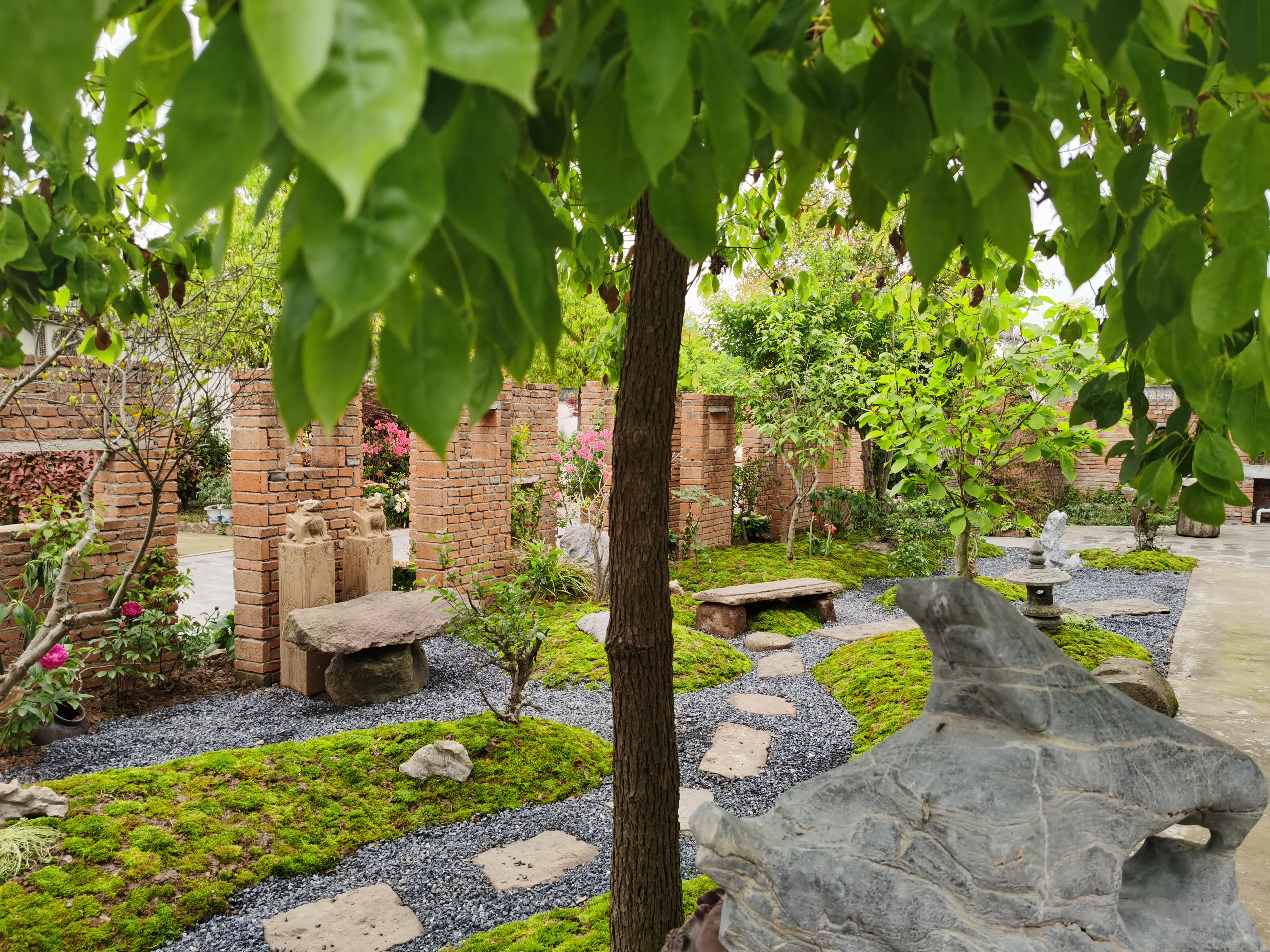 蔥郁園中果木多,藍天碧水柳婆娑。