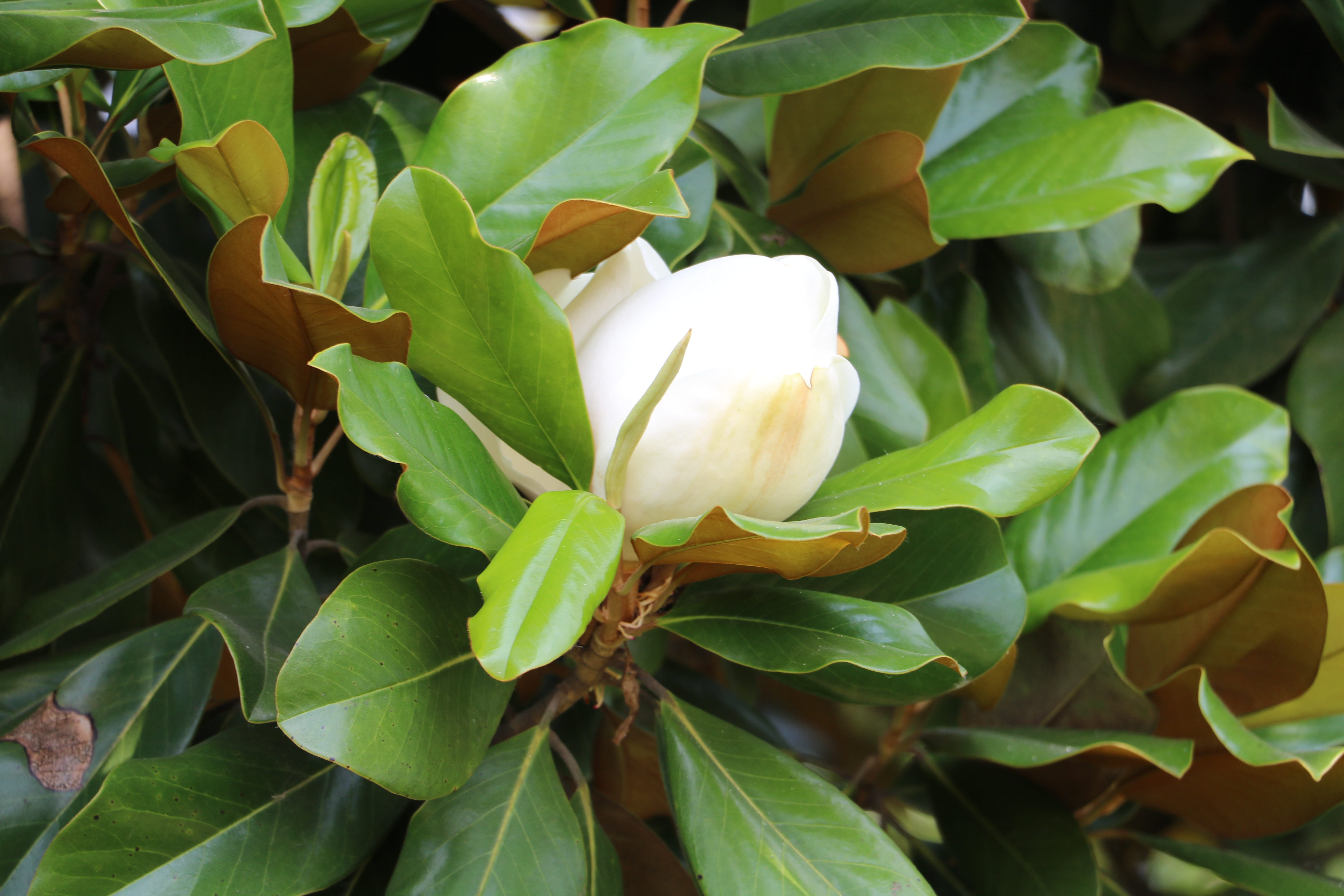 漫步一二里,便到了園內的白玉蘭林,陽春下,微風里,白玉蘭樹斜斜的伸展著,蒼翠碧綠,朵朵白玉蘭優雅寧靜的綻放。