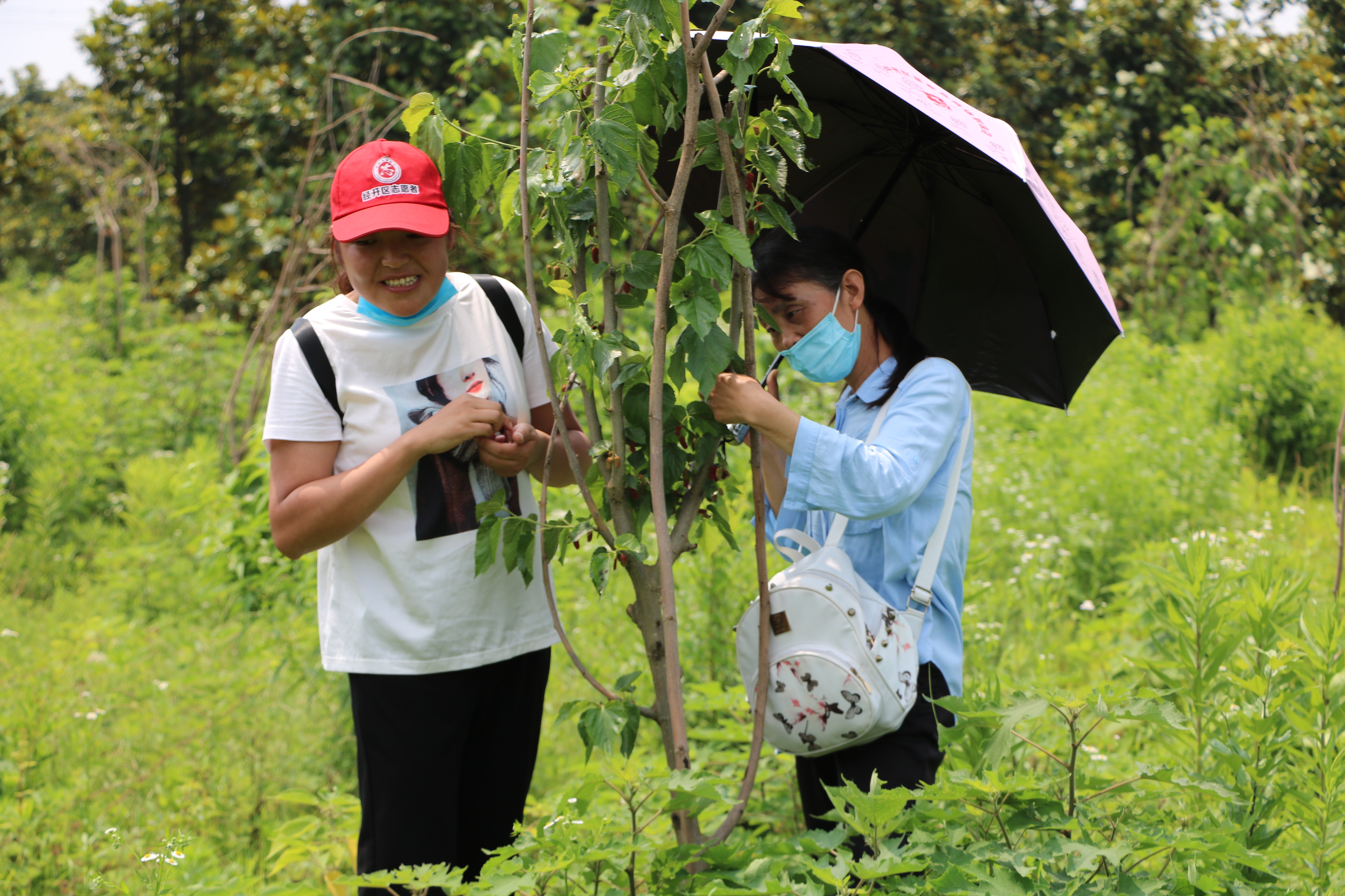 不遠處便是桑葚林,一叢叢桑葚樹,枝椏上綴滿了黑紅色的桑葚,大家采摘桑葚、桑葉,回味童年趣事,歡聲笑語不絕于耳。