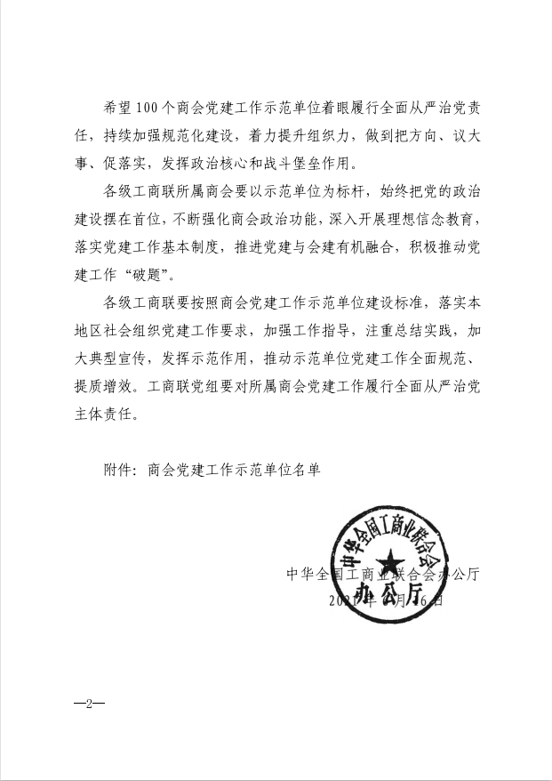為慶祝中國共產黨成立100周年,加強工商聯所屬商會黨建工作,全面推進商會黨組織標準化、規范化建設,全國工商聯組織開展了商會黨建工作示范單位培樹活動。按照“政治功能強、組織建設好、融合發展好、履行責任好、各方反映好”的建設標準,在各地工商聯逐級推薦、省級工商聯審查把關、全國工商聯組織審核的基礎上,經全國工商聯黨組會議審議通過,將100個商會黨組織確定為商會黨建工作示范單位。安徽省新興產業協會黨支部獲評全國“商會黨建工作示范單位”榮譽稱號。