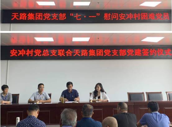 2020年7月1日下午,安徽省天路工程建設集團黨支部書記張世偉帶隊到長豐縣金湖社區安沖村開展建黨99周年慰問困難黨員活動,并與安沖村黨總支舉行黨建簽約儀式。安徽省天路工程建設集團經營總裁曹家云、安徽天鷺農業科技有限公司總經理薛兆銀、辦公室主任董俊等多名黨員和積極分子參加活動,安沖村黨總支部書記陸應柱、村兩委主要領導班子成員和16名困難黨員、4名抗疫一線優秀工作者親切接見、舉行黨建座談。