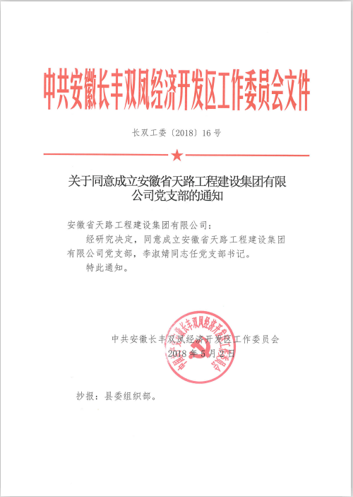 2018年5月2日,安徽長豐雙鳳經(jīng)濟(jì)開發(fā)區(qū)工作委員會(huì)經(jīng)研究決定,同意安徽省天路工程建設(shè)集團(tuán)有限公司成立黨支部,并發(fā)布文件通知。
