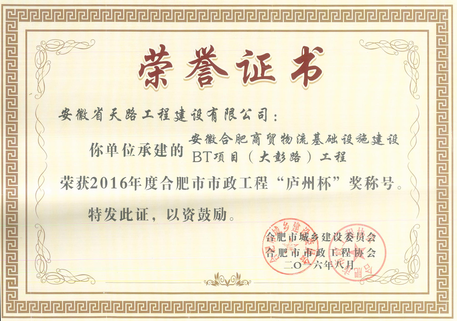 獲獎(jiǎng)喜報(bào):安徽省天路工程建設(shè)有限公司榮獲2016年度合肥市市政工程“廬州杯”獎(jiǎng)稱號(hào)。