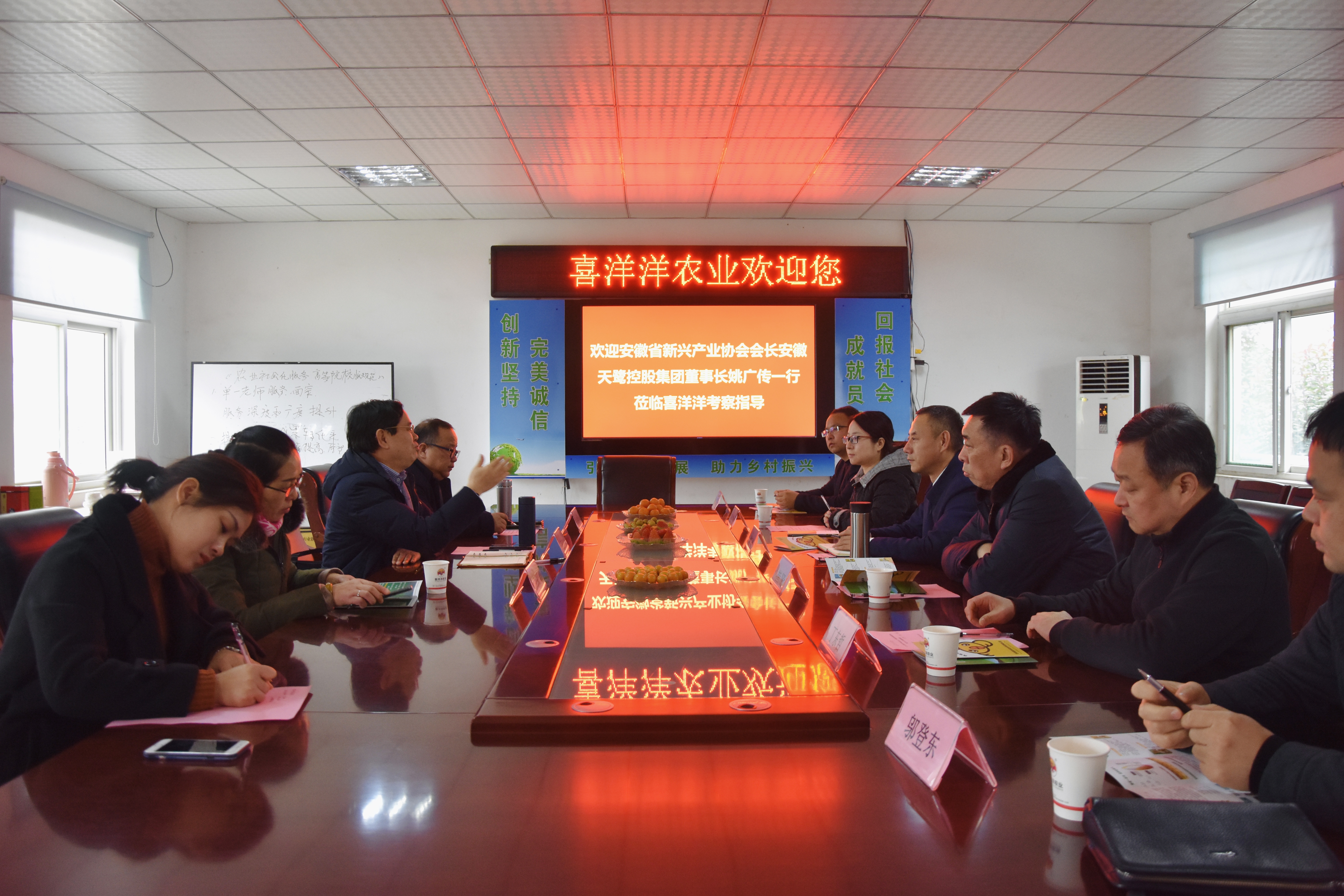 2021年1月5日上午,安徽省新興產業協會會長、安徽天鷺控股集團董事長姚廣傳,協會常務副會長、合肥華興物業管理有限公司董事長崔賢,協會常務副會長、合肥市僑聯副主席孔德怡,協會副會長、安徽天鷺文化旅游產業股份有限公司總經理丁家揚,協會副會長、安徽天鷺農業科技有限公司總經理李景源及秘書處一行赴安徽喜洋洋農業科技有限公司農業基地參觀考察。喜洋洋農業公司董事長王宜坤、總經理華勝熱情的接待了姚廣傳董事長一行,雙方在會議室進行了親切的交流。