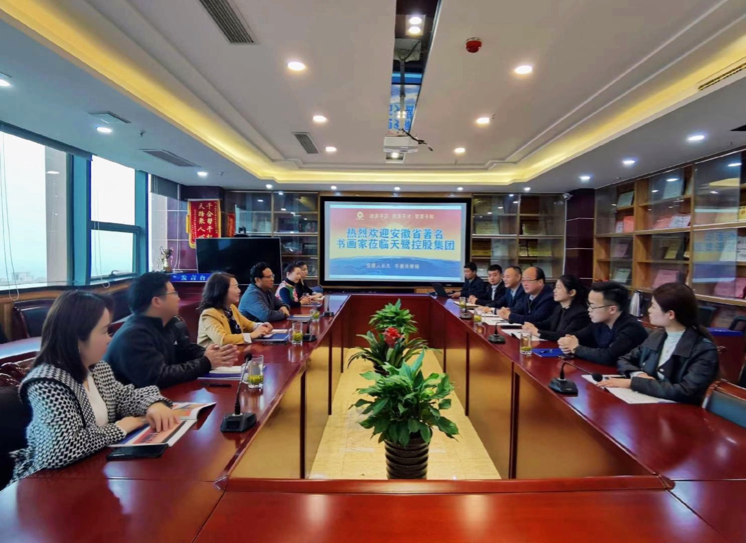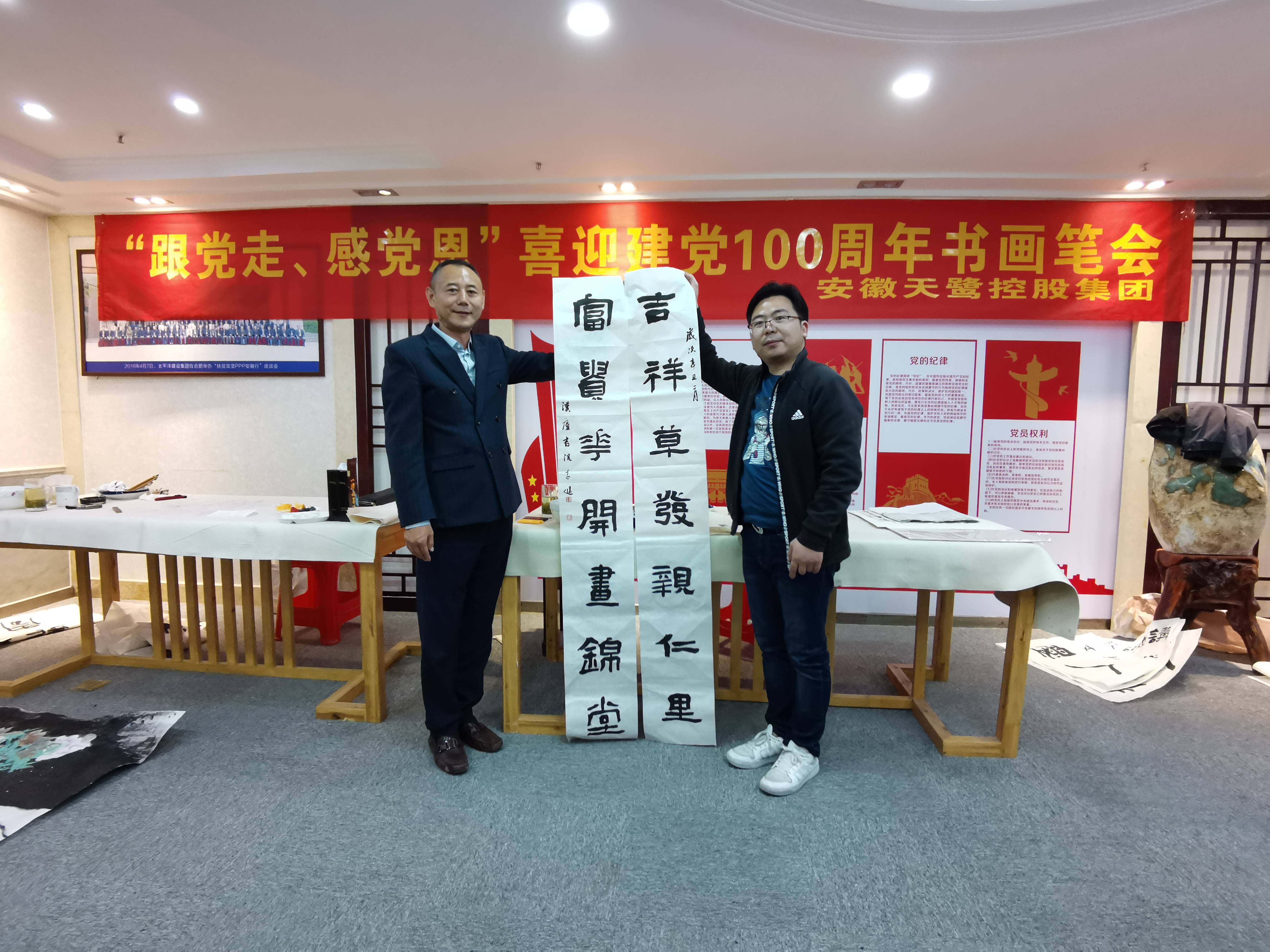 中國美協會員、國家一級美術師、巢湖市美協主席周圣祥,巢湖市政協委員、民建中央畫院院士楊順翠,中國美術家協會安徽省分會會員、國家一級美術師汪瓊,江蘇省書法家協會會員、安徽省青年書法家協會隸書委員會委員李健等書畫家們齊聚安徽天鷺控股集團黨建活動室揮毫潑墨,將對黨的祝福凝聚在筆尖,用牡丹、蘭花、松竹、山水等水墨丹青畫寄托對黨、對祖國的美好祝福,用詩詞、對聯等書法作品回憶黨的崢嶸歲月,向黨致敬,向建黨一百周年獻禮。